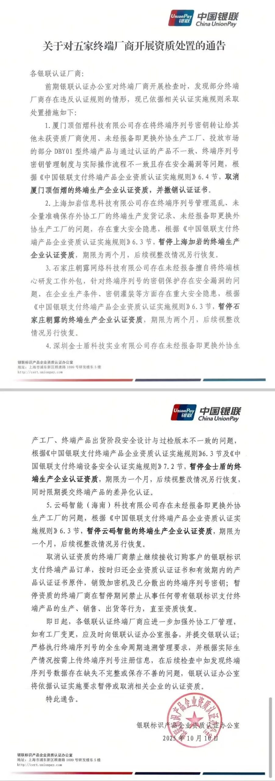 4:深圳金士盾(MPOS/微智能出货量第一)换代工厂未报备,出货阶段安全设计与过检版本不一致,被暂停终端生产企业认证资质一个月。