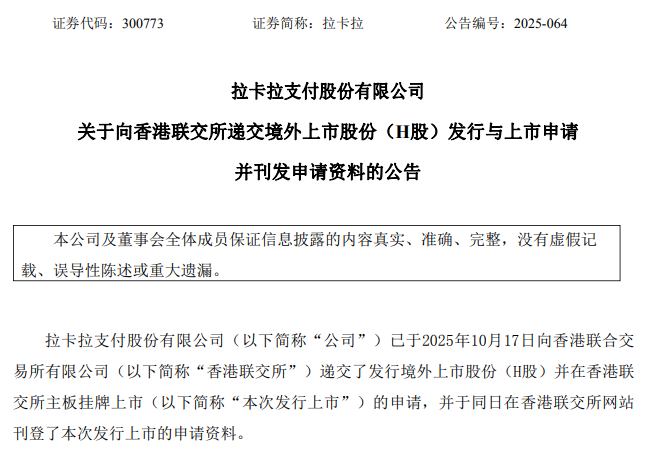 近日,支付公司拉卡拉支付股份有限公司(以下简称“拉卡拉”)发布公告,公司已向香港联合交易所有限公司(以下简称“港交所”)递交了发行境外上市股份(H股)并在港交所主板挂牌上市的申请,并于同日在港交所网站刊登了本次发行上市的申请资料。若此次港股上市成功,拉卡拉将实现“A+H”股上市格局。