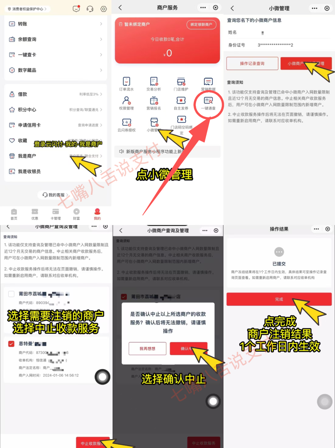 今年6月,小编曾发布了《独家:小微商户注销功能正式上线!实测好用!(附完整教程)》一文,文章介绍利用云闪付上的“小微管理”功能去注销,具体流程如下: