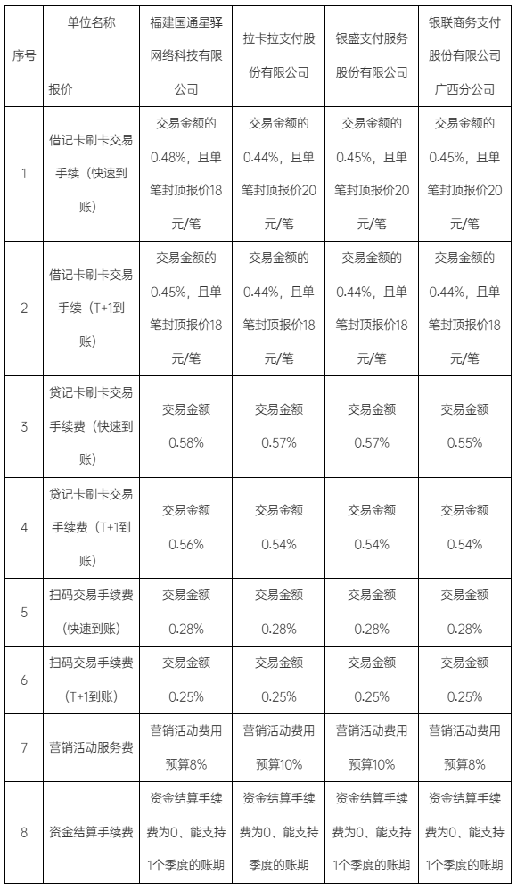 拟中标人:福建国通星驿网络科技有限公司、拉卡拉支付股份有限公司、银盛支付服务股份有限公司、银联商务支付股份有限公司广西分公司