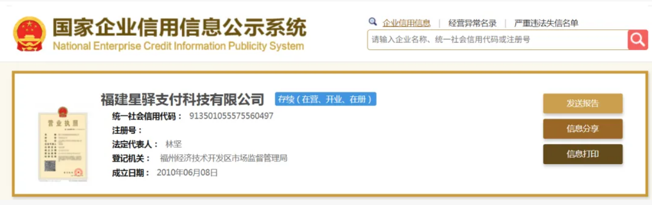 公开资料显示,国通星驿成立于2010年6月,注册资本为30000万元,是上市公司新大陆的控股子公司。2012年获得支付牌照,人行准许其在全国范围内开展银行卡收单业务,2024年支付业务类型调整后,业务类型调整为“支付交易处理Ⅰ类”。