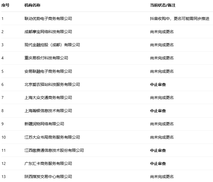 尽管大多数支付机构已响应监管要求完成更名,但仍有13家机构尚未完成这一合规动作。这些机构的情况各不相同,部分面临特殊挑战: