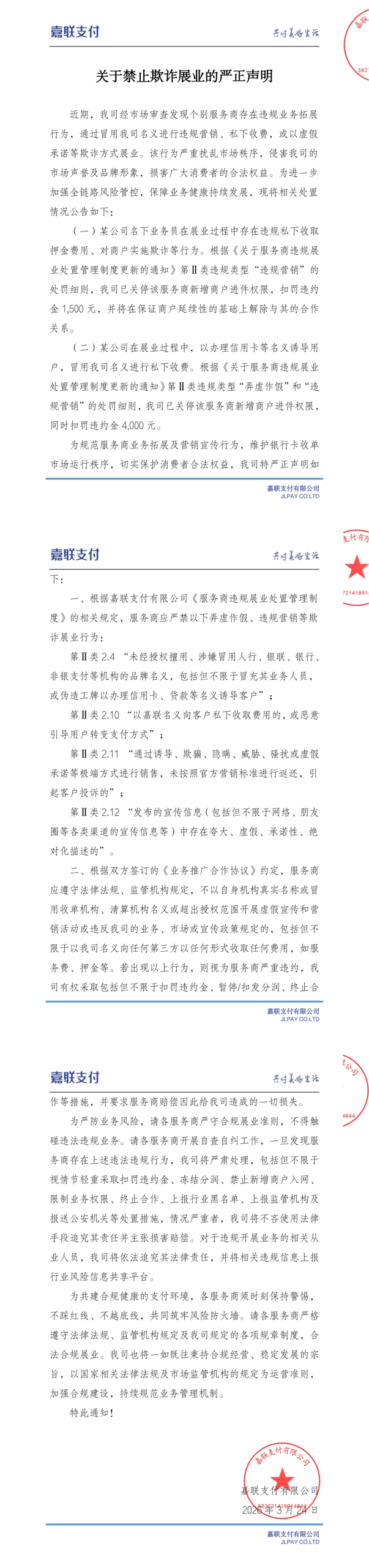 3月24日,嘉联支付发布了“关于禁止欺诈展业的严正声明”,根据该声明显示,两家嘉联支付服务商因违规展业被嘉联支付处罚,同时关停新增商户进件权限。